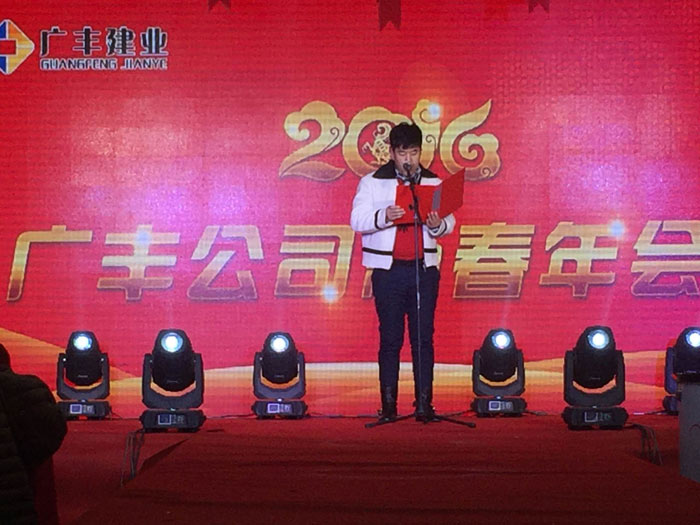 下午4點半,伴隨著新年的祝福聲、歡呼聲和主持人熱情洋溢的祝福聲,廣豐集團(tuán)2016新春年會正式開始,集團(tuán)公司董事長王曉軍先生首先致辭,向公司全體員工致以新春的問候和美好的祝福。